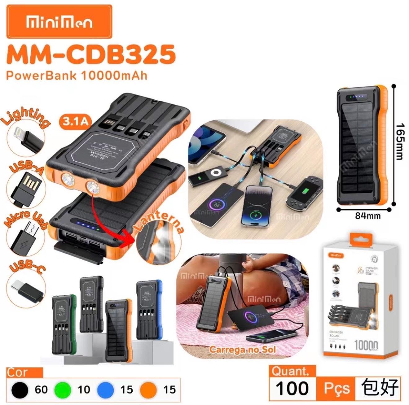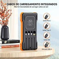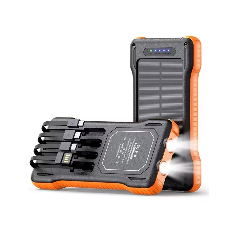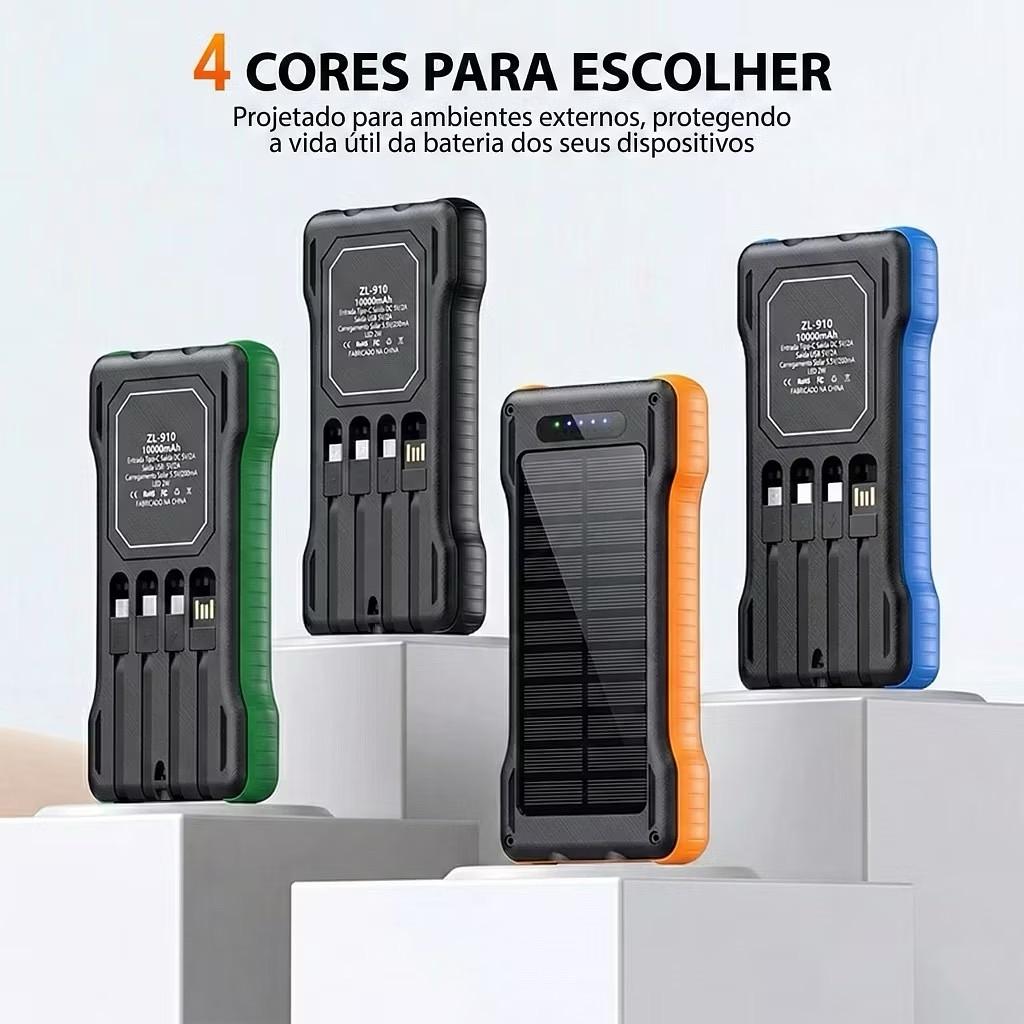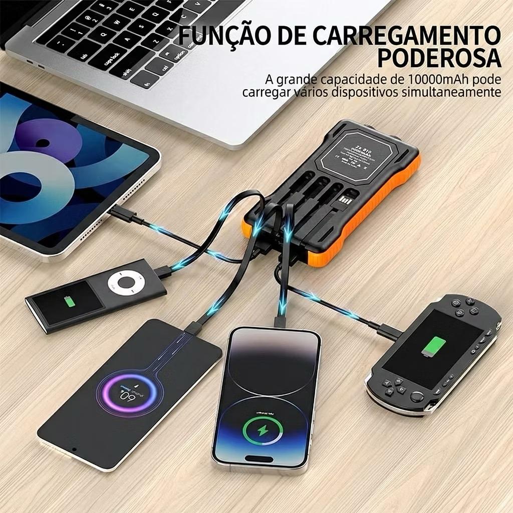 Carregador Portátil Solar Power Bank 10000mAh 4 Cabos Embutidos Lanterna LED Universal USB