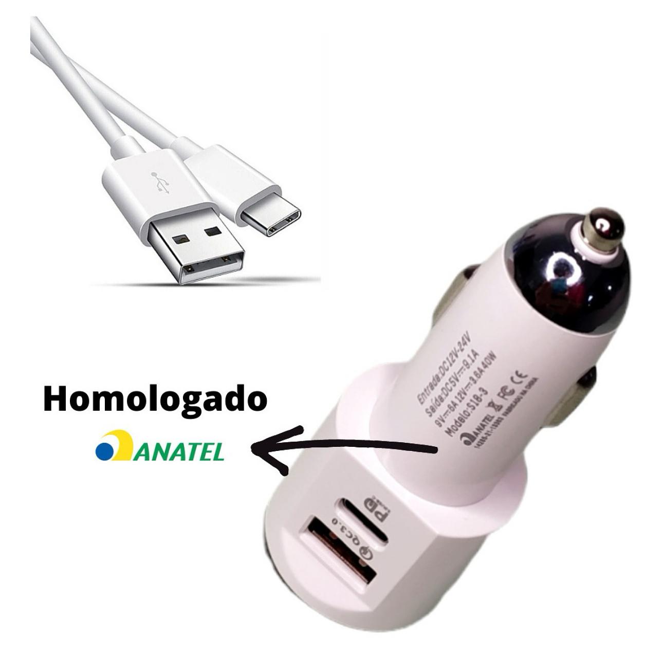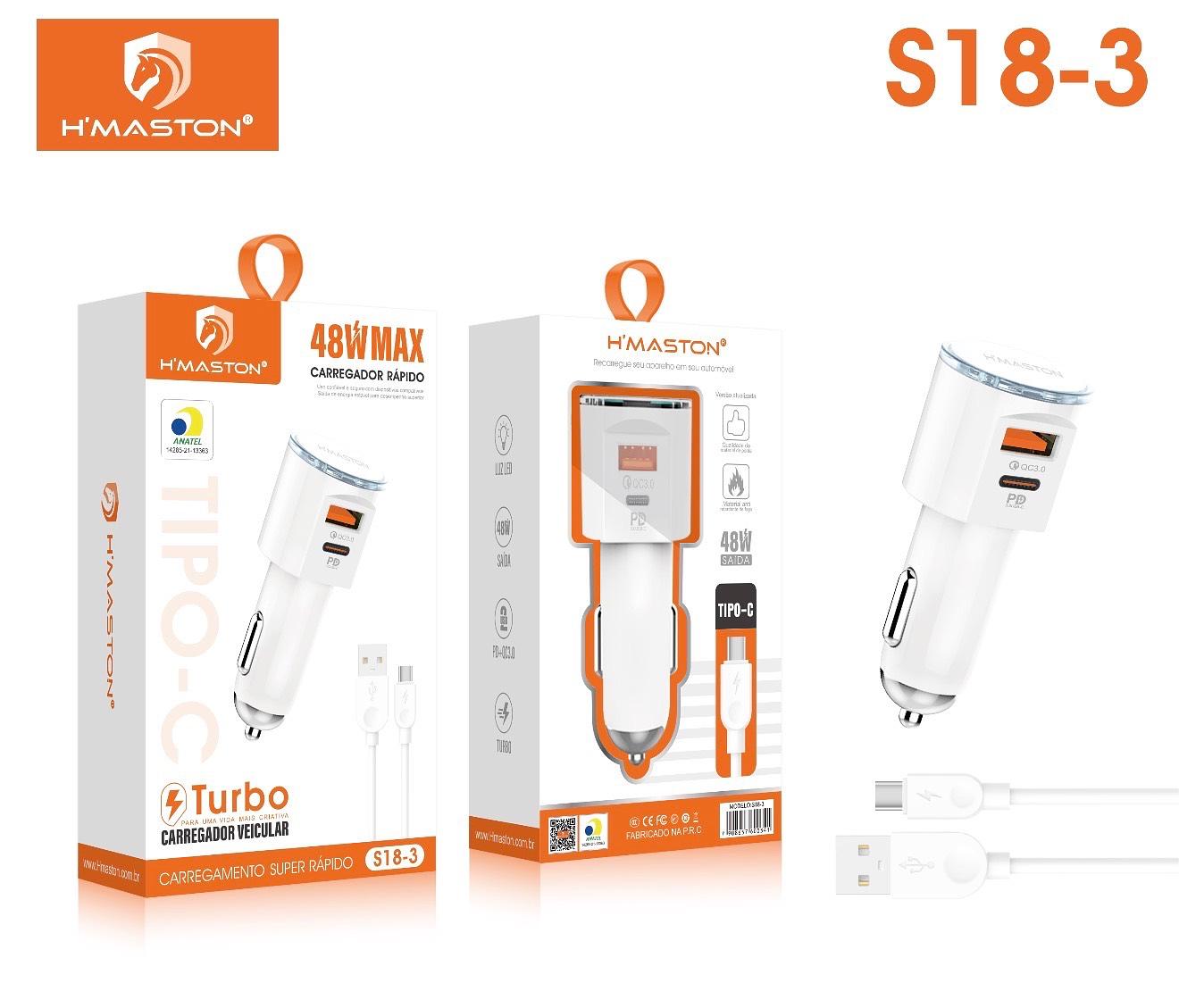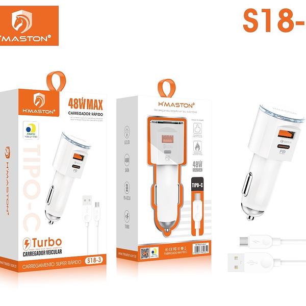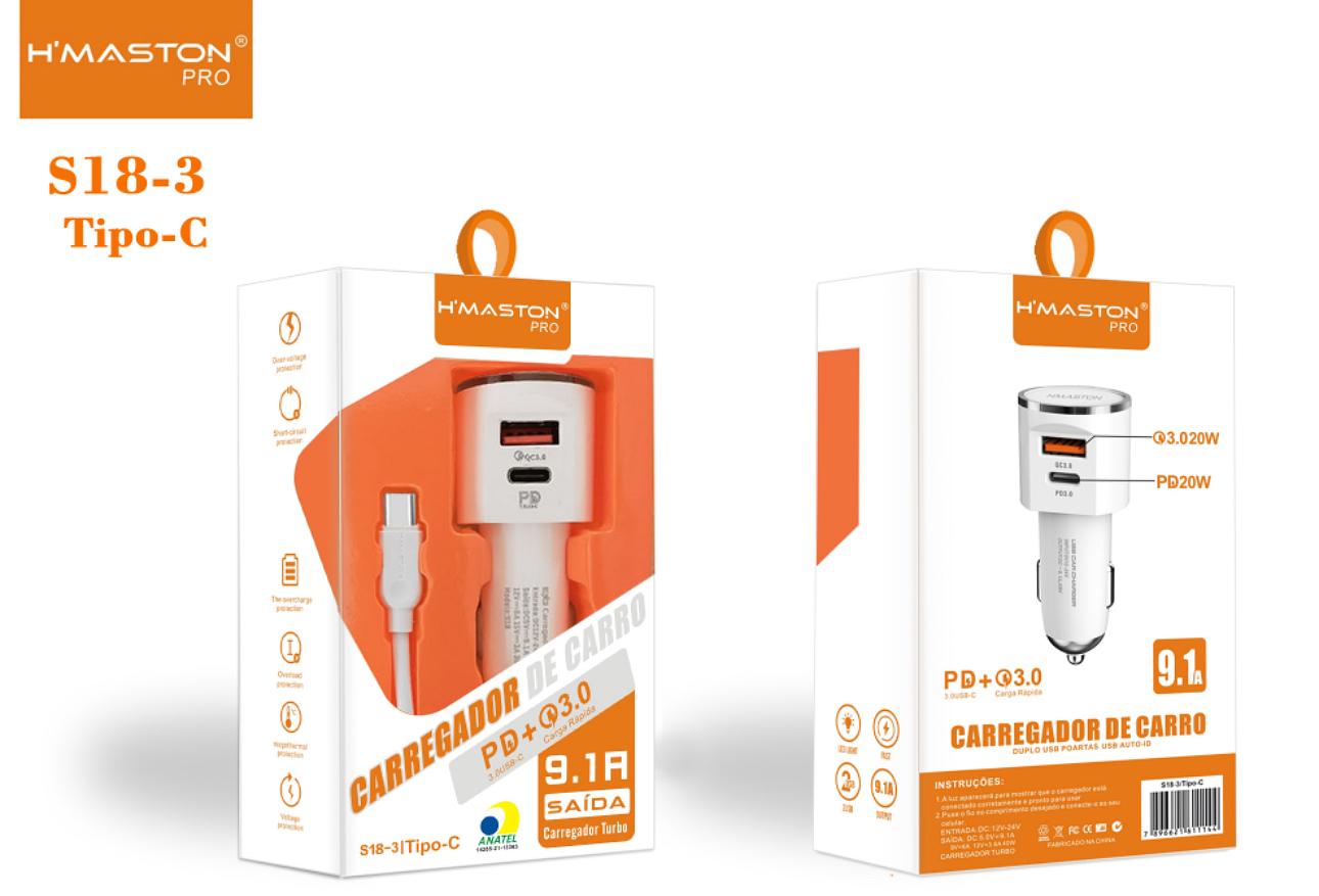 Carregador Veicular Turbo 9.1a Duplo, Carro, Qc 3.0 + Cabo Tipo C,Hmaston