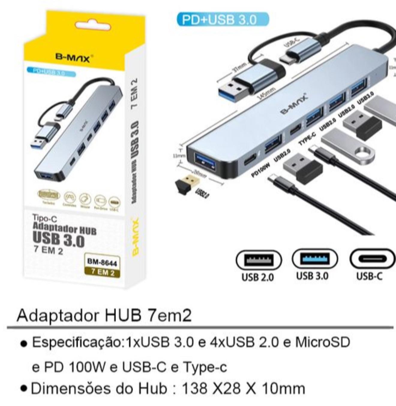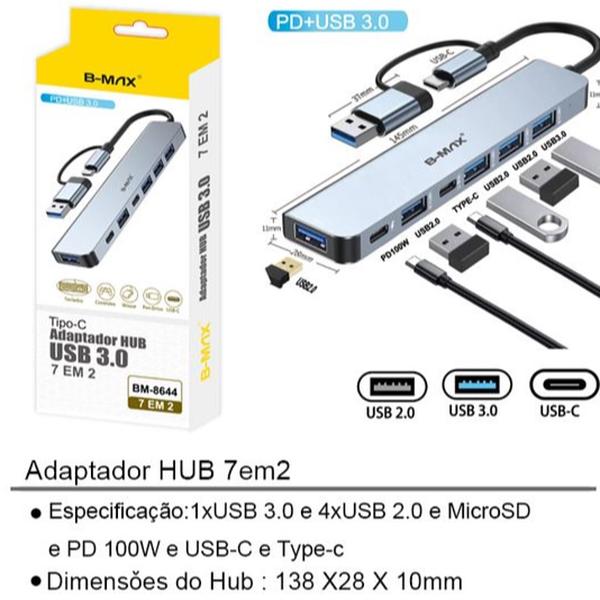 Hub USB-C e USB-A 3.0, Adaptador 7 em 1, Portátil, Veloz e Multifuncional Para Computadores, Smartphones, Tablets e PC
