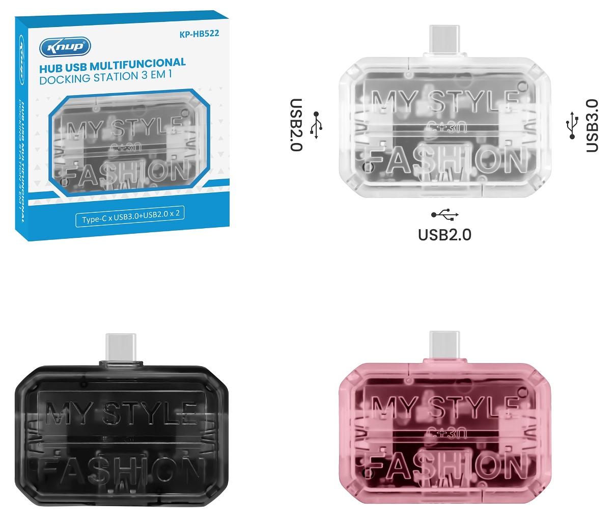 Novo produto transparente 3 em 1 multifuncional tipo C Docking Station porta USB-C para USB2.0+ USB2.0 + USB3.0