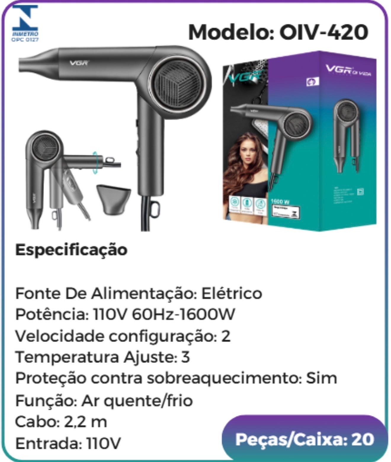 Secador de Cabelo VGR OIV-420 Profissional 1600W 110V Dobrável Cabo 2.2m Ar Quente e Frio Potente