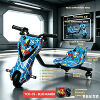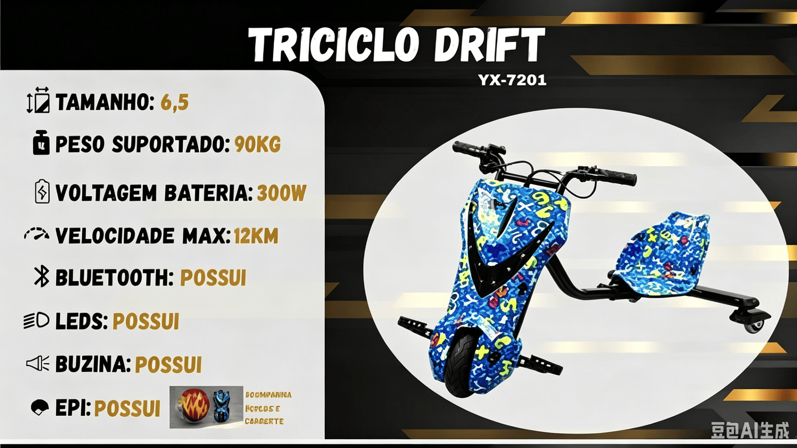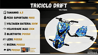 Triciclo elétrico infantil de 6,5 polegadas e 300W com luzes LED, Bluetooth, 3 velocidades e equipamentos de proteção (capacete, joelheiras e cotoveleiras).